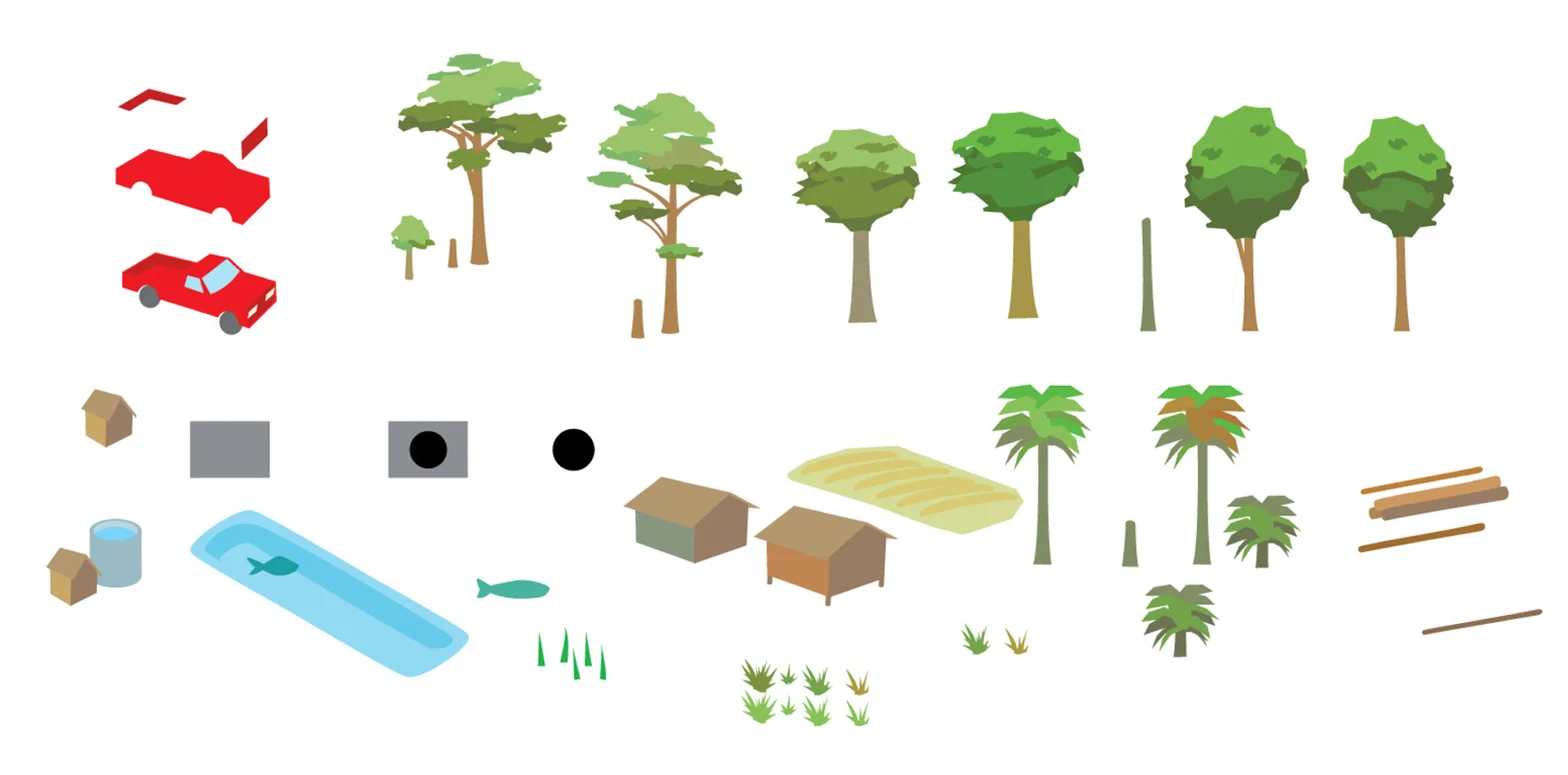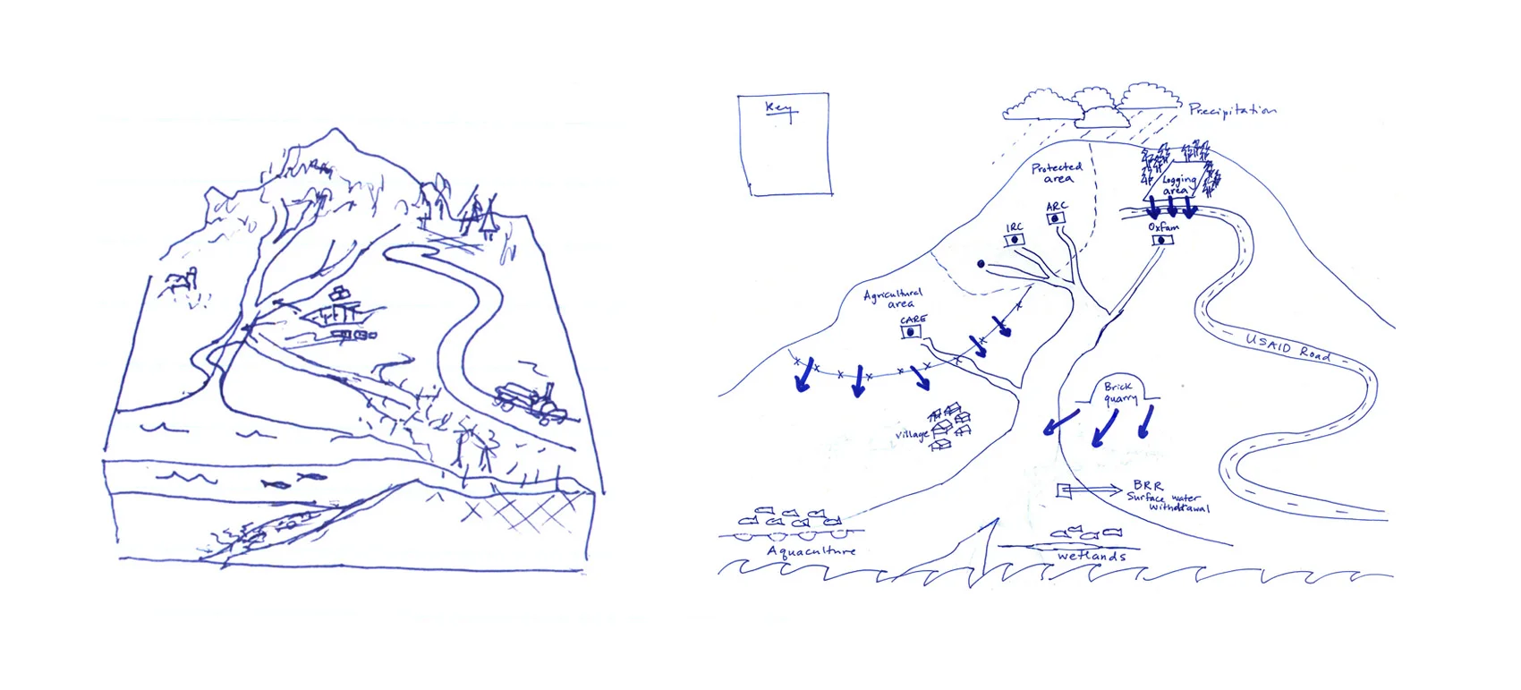 This is a digital illustration for the World Wildlife Fund which shows the path of rainwater runoff from various sites. All illustrated elements are original.